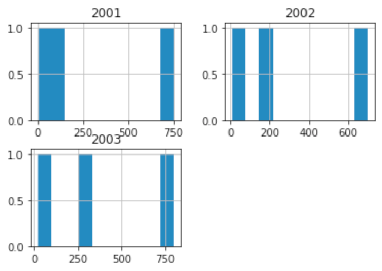df.hist(by='2002')De cette manière je peux analyser les données pour une colonne spécifique.